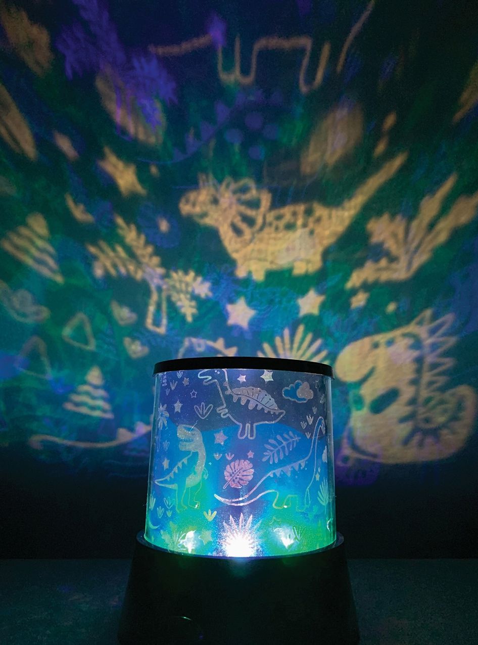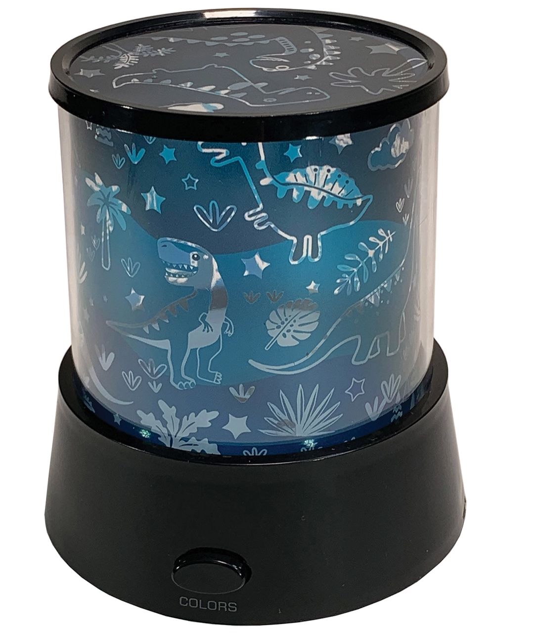 Turn any room into a dino den! This fun projector casts colorful dinosaur scenes on walls or ceilings with two settings—steady white or color-changing light. Requires 3 AA batteries (not included).